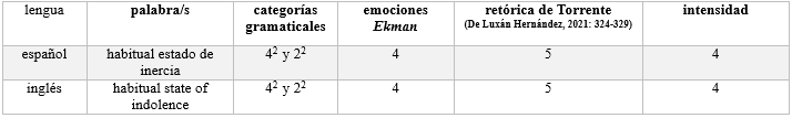 Estamos ante un supuesto de doble categoría gramatical. Por un lado, puede advertirse la presencia de un doble sustantivo (42) en ambos fragmentos: estado/state e inercia/indolencia y, por otro, de un doble adjetivo (22): habitual/habitual y de inercia/of indolence. El protagonista es la inercia/indolencia, considerada como sustantivo con entidad propia, aunque con la también atribuible función de adyacente del nombre estado/state, que, por sí mismo, no es emocional.