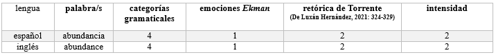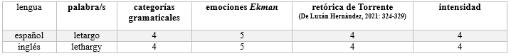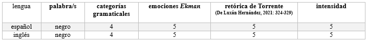 A la categoría gramatical afectiva le acompaña una emoción ekmaniana (1992, 34): el miedo, el enfado, la tristeza, el disgusto y la sorpresa. Como puede observarse, dado que estamos ante un texto de corte emocional negativo, el gradiente, del 1 al 5, se ha establecido en función de más a menos fuerza negativa. De este modo, el miedo, definido por el DLE como “[la] angustia por un riesgo o daño real o imaginario [; el] recelo o aprensión que alguien tiene de que le suceda algo contrario a lo que desea”, se configura como la emoción de corte menos positiva y con más fuerza, de ahí que se le atribuya el número `5´.