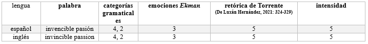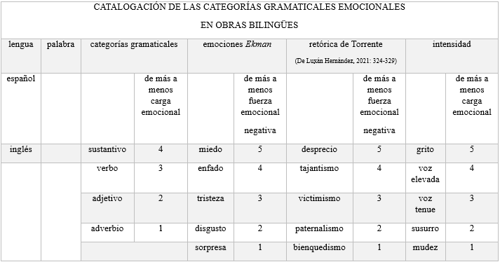 Como puede observarse, al estar ante un texto bilingüe, debe el filólogo hacer una distinción entre lo escrito en español y lo redactado en inglés, de tal forma que pueda efectuarse un análisis contrastivo. Tendrá también que señalar ante qué categoría gramatical se está. Esta tarea lleva aparejada, además, la asignación de un número del 1 al 4, en donde el `4´ representa la mayor carga emocional, y el `1´, la menor. Nos hemos decantado únicamente por las categorías independientes (sustantivo, verbo, adjetivo, adverbio), al ser estas las de mayor sema emocional.