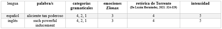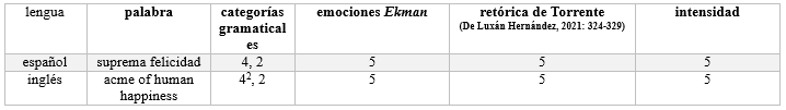 Como colofón del fragmento, el sintagma nominal suprema felicidad/acme of human happiness hace de bombo y platillo del adagio en forte en pro de la no abolición de la esclavitud. En una lectura superficial, podríamos pensar que la emoción es positiva en sí misma. No obstante, en una interpretación más profunda, en la que tenemos en cuenta la visión de Sperber y Wilson de ostensión e inferencia, observamos que el autor nos muestra el sustantivo felicidad/happiness para que el lector efectúe la inferencia negativa de que la felicidad del negro radica en estar todo el día y toda la noche acostado. Por tanto, interpretamos que la emoción que predomina es el miedo con tintes falsos de tristeza y acompañado de acordes enérgicos de desprecio. La intensidad es de un grito porque Torrente cree de manera categórica en lo que expresa: fusiona su estructura profunda (pensamiento) con la estructura superficial (lenguaje) chomskyanas.