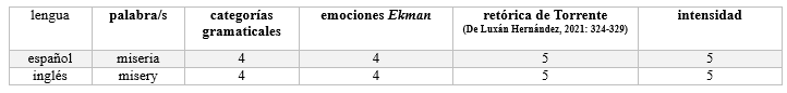 Los sustantivos emocionales, considerados tradicionalmente como abstractos por una exclusión no del todo satisfactoria, son también palpables y, por tanto, reales. Cuando el emisor expresa una emoción, no es independiente a ella, sino que esta se le manifiesta a través de uno o más sentidos. Por ejemplo, el miedo no solo se siente con la arritmia, sino también con el tacto a través de la transpiración. En el texto que nos convoca, el vocablo miseria/misery, calificado por la gramática como abstracto, se externaliza a través de la inacción del trabajo del negro/negro. Esto está abocado a producir en el receptor una sensación de rabia, miedo, desasosiego e impotencia, que se traduce en rojeces en la piel, en ardores y en sudores.