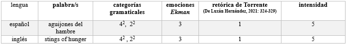 Al igual que en el supuesto anterior, para demostrar el bienquedismo que aquí nos convoca, hace uso de una doble categoría gramatical, y es el sustantivo emocional (hambre/hunger) el que también actúa de adyacente del que no presenta esa carga tan afectiva (aguijones/stings), aunque unido a hambre/hunger, su valor emocional aumenta.